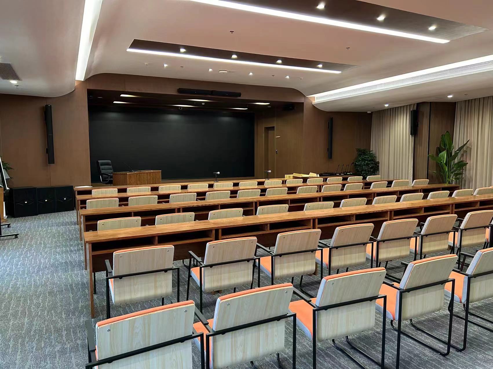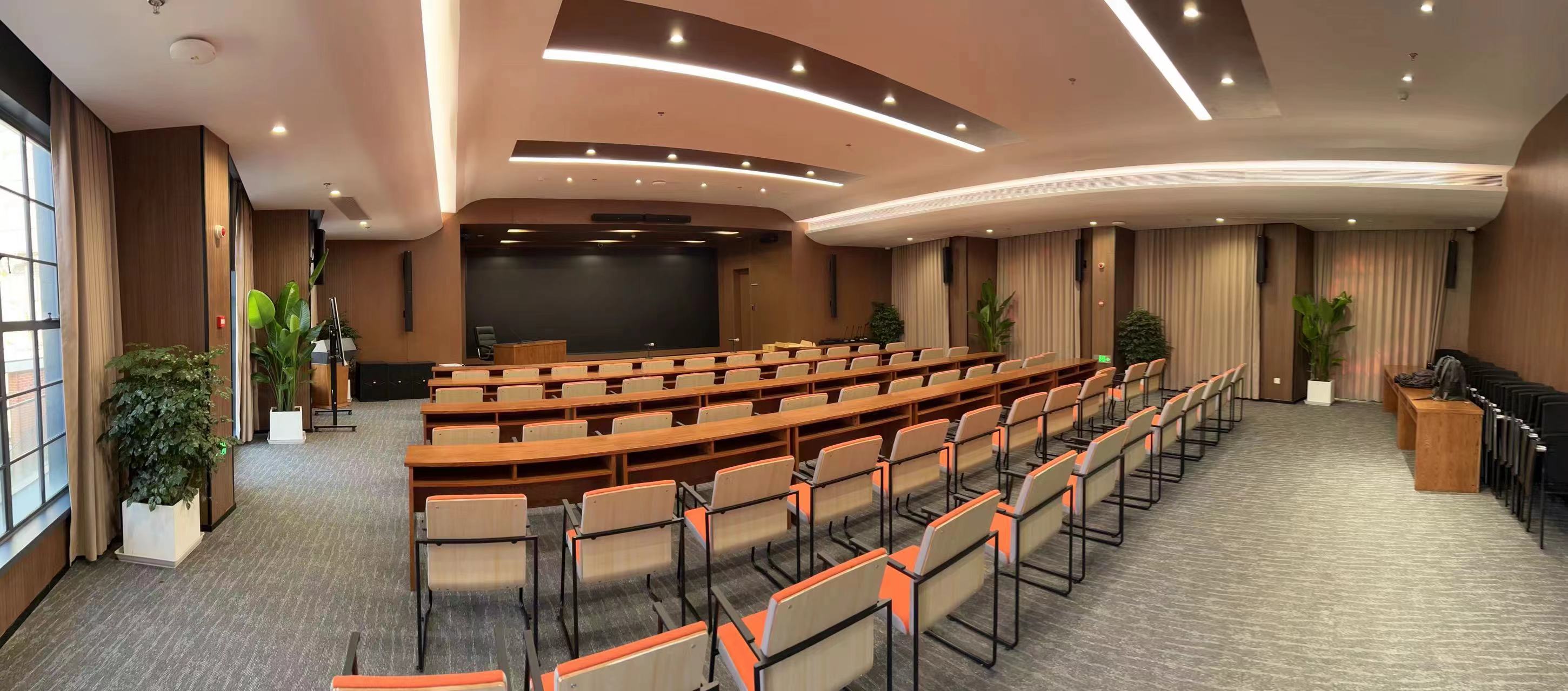 EMX使用一套馭波陣列小型化的音響系統(tǒng)完美的解決了整個(gè)多功能廳堂的擴(kuò)聲問(wèn)題。 左右主擴(kuò)聲采用 EMX CRA0644馭波陣列揚(yáng)聲器, 中置音箱使用EMX獨(dú)有的橫柱音響 EMX 501,配合上超低音EMX 5005,另外使用 EMX CRA46作為環(huán)繞音響。整套系統(tǒng)在語(yǔ)言擴(kuò)聲時(shí),聲音飽滿, 語(yǔ)言清晰度高,整場(chǎng)聲場(chǎng)均勻度佳,完全滿足國(guó)家多功能廳堂擴(kuò)聲系統(tǒng)一級(jí)標(biāo)準(zhǔn)。 在播放電影時(shí),這套系統(tǒng)又是一套專業(yè)影院級(jí)7.1還音系統(tǒng),可以讓觀眾感受到身臨其境的沉浸式音響體驗(yàn)。音響安裝簡(jiǎn)單,音響小巧的體型和優(yōu)雅的外觀很好的和裝飾相配合。 一套音響系統(tǒng)解決了傳統(tǒng)需要多套系統(tǒng)才能達(dá)成的功能,整套系統(tǒng)可以按照?qǐng)鼍暗牟煌M(jìn)行模式的設(shè)置和切換, 操作維護(hù)十分方便,擴(kuò)聲效果更是一鳴驚人,完全超出業(yè)主預(yù)期效果,獲得高度贊許。